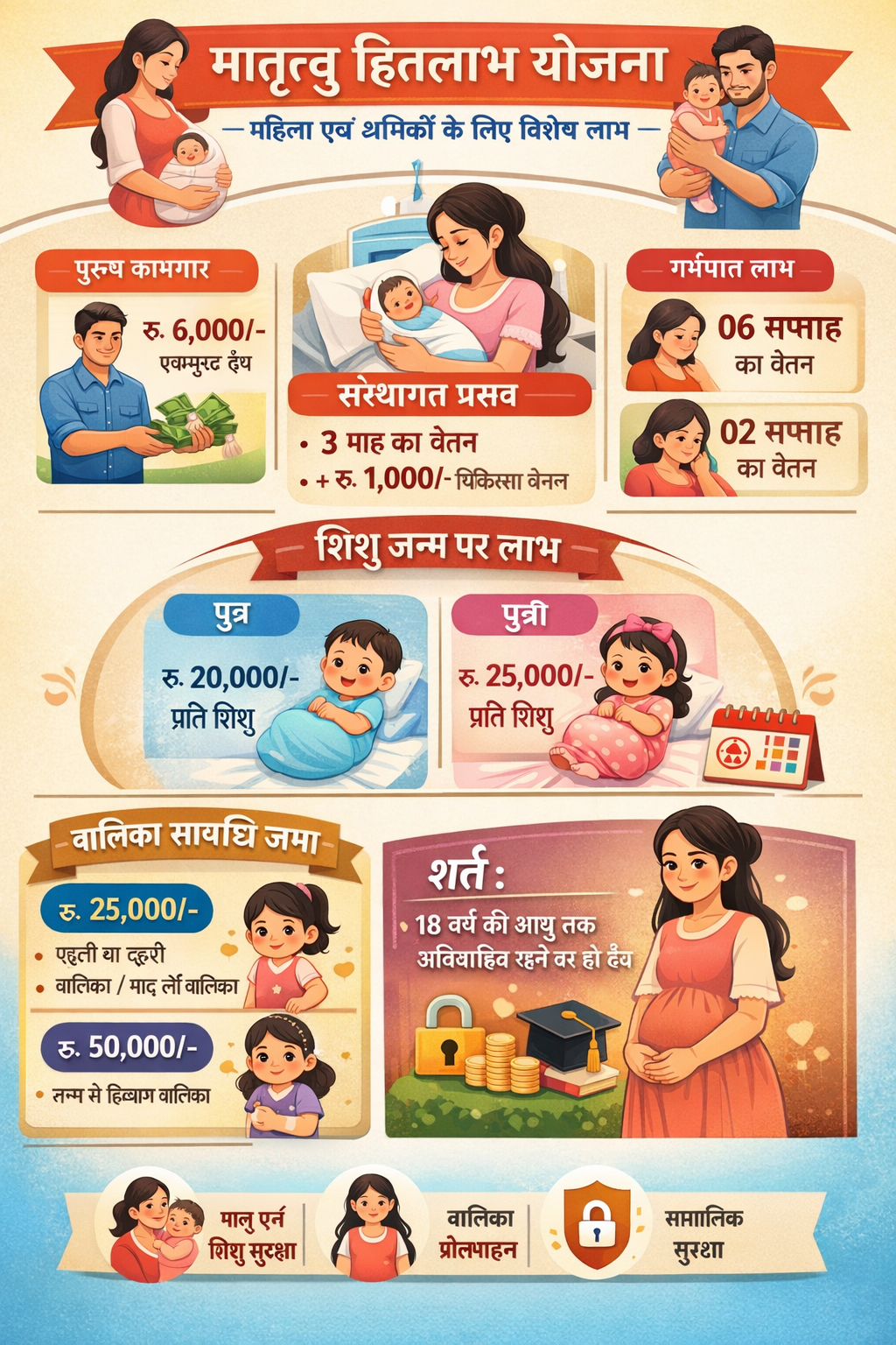 मातृत्व किसी भी समाज की सबसे महत्वपूर्ण सामाजिक प्रक्रिया है। एक स्वस्थ माँ और स्वस्थ शिशु ही किसी भी राष्ट्र के उज्ज्वल भविष्य की नींव होते हैं। विशेष रूप से असंगठित क्षेत्र में कार्यरत श्रमिक वर्ग, जिनकी आर्थिक स्थिति सीमित होती है, उनके लिए गर्भावस्था एवं शिशु जन्म के दौरान आर्थिक सहायता अत्यंत आवश्यक हो जाती है। इसी आवश्यकता को ध्यान में रखते हुए सरकार द्वारा मातृत्व हितलाभ योजना संचालित की जाती है। इस योजना का उद्देश्य गर्भावस्था, प्रसव, शिशु पालन तथा परिवार नियोजन के दौरान श्रमिक परिवारों को आर्थिक सुरक्षा प्रदान करना है।