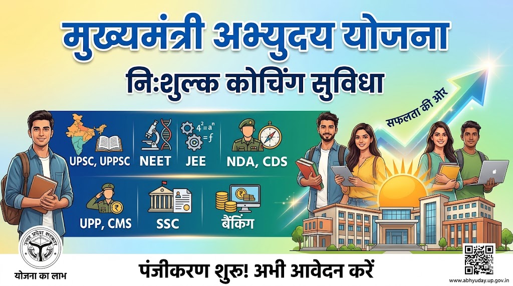 पी सरकार की 'मुख्यमंत्री अभ्युदय योजना 2026' के तहत UPSC, UPPSC, NEET, JEE, NDA आदि के लिए निःशुल्क कोचिंग प्राप्त करें। पात्रता, आवश्यक दस्तावेज और ऑनलाइन आवेदन की पूरी जानकारी यहाँ देखें।
