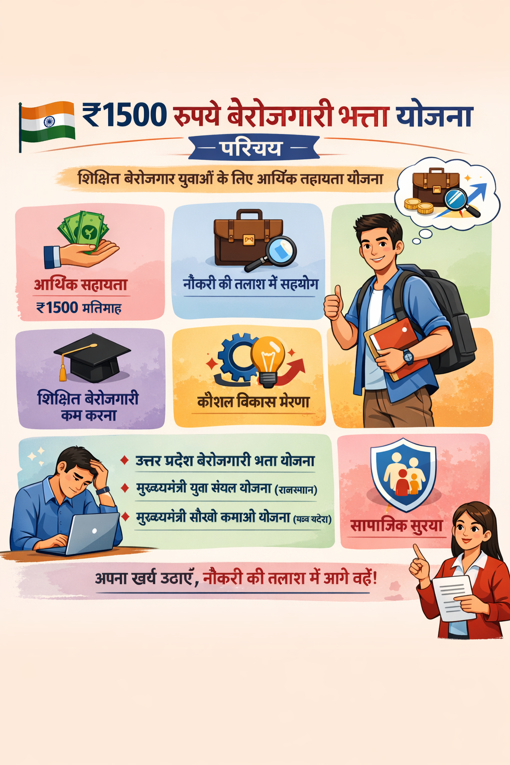 उत्तर प्रदेश की 1500 Berojgari Bhatta Yojana शिक्षित बेरोजगार युवाओं को आर्थिक सहायता प्रदान करने के लिए एक महत्वपूर्ण योजना है।उत्तर प्रदेश बेरोजगारी भत्ता योजना राज्य सरकार द्वारा चलाई गई एक महत्वपूर्ण योजना है, जिसका उद्देश्य शिक्षित बेरोजगार युवाओं को आर्थिक सहायता प्रदान करना है। इस योजना के तहत पात्र युवाओं को नौकरी मिलने तक प्रतिमाह आर्थिक सहायता दी जाती है ताकि वे अपनी दैनिक आवश्यकताओं को पूरा कर सकें और रोजगार की तलाश जारी रख सकें।इस योजना में पंजीकृत बेरोजगार युवाओं को लगभग 1000 से 1500 प्रति माह तक भत्ता प्रदान किया जाता है। भत्ता राशि सीधे लाभार्थी के बैंक खाते में भेजी जाती है। यह योजना उन युवाओं के लिए सहायक है जो पढ़ाई पूरी करने के बाद भी रोजगार प्राप्त नहीं कर पाए हैं।बेरोजगारी भत्ता योजना का मुख्य उद्देश्य युवाओं को आत्मनिर्भर बनने में मदद करना और उनकी आर्थिक परेशानियों को कम करना है। इसके माध्यम से सरकार युवाओं को रोजगार कार्यालय में पंजीकरण कराने और सरकारी रोजगार सेवाओं से जुड़ने के लिए भी प्रोत्साहित करती है। यह योजना विशेष रूप से 12वीं पास, स्नातक या अन्य शिक्षित बेरोजगार युवाओं के लिए लाभकारी है, जिनकी आय सीमित है और जिनके पास कोई स्थायी रोजगार नहीं है।