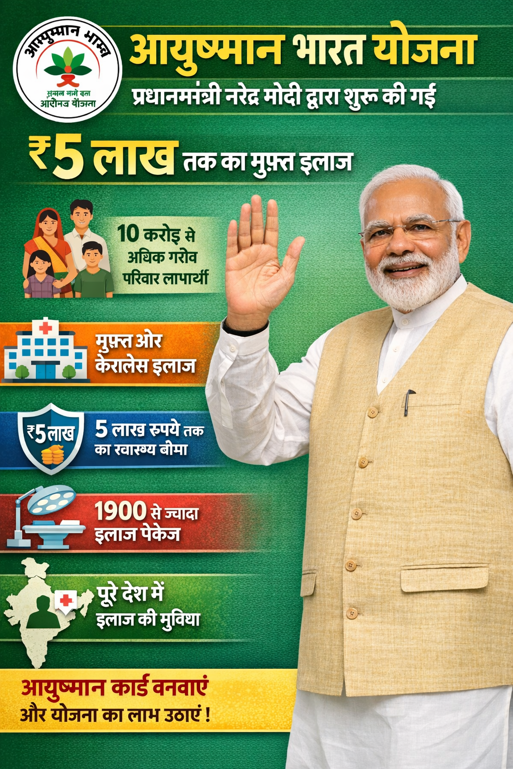 आयुष्मान भारत योजना मुफ्त स्वास्थ्य बीमा सुविधा प्रदान करना है।  भारत सरकार द्वारा शुरू की गई एक ऐतिहासिक स्वास्थ्य योजना है। इसे था। इस योजना का उद्देश्य गरीब और कमजोर वर्ग के परिवारों को मुफ्त स्वास्थ्य बीमा सुविधा प्रदान करना है। भारत मे इलाज के दौरान मृत्य हो जाती गरीब होने से रूपए एकठा नहीं हो पाते प्रधानमंत्री इस बात कप गंभीरता से लेते हुये प्रधानमन्त्री जी ने 23 सितम्बर 2018 को लागु  किया गया आज के दिन हर गाँव में आशा या पंचायक सहायक के द्रारा फ्री आयुष्मान कार्ड बनाया जाता है नजदीकी CSC सेंटर पर जाकर भी बनाया जा सकता हैइस योजना को प्रधानमंत्री जन आरोग्य योजना (PM-JAY) के नाम से भी जाना जाता है।
