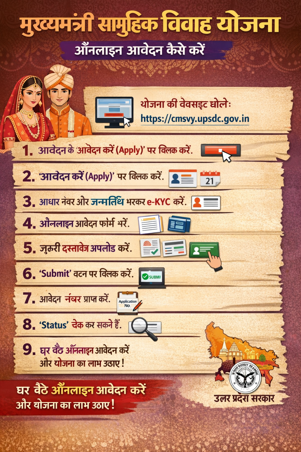 मुख्यमंत्री सामूहिक विवाह योजना उत्तर प्रदेश सरकार की शुरू की गई है। इस स्कीम का मुख्य मकसद आर्थिक रूप से कमजोर परिवारों को उनकी बेटियों की शादी के लिए मदद देना और समाज में कम्युनिटी शादियों के कॉन्सेप्ट को बढ़ावा देना है। कई गरीब परिवारों को अपनी बेटियों की शादी अरेंज करने में पैसे की दिक्कतों का सामना करना पड़ता है। इस बोझ को कम करने के लिए, राज्य सरकार ने यह स्कीम शुरू की ताकि ज़रूरतमंद परिवारों को शादी के समय सहारा मिल सके।इस स्कीम के तहत फ़ायदा पाने के लिए, कुछ एलिजिबिलिटी शर्तें पूरी होनी चाहिए। दुल्हन की कम से कम उम्र 18 साल और दूल्हे की कम से कम 21 साल होनी चाहिए। परिवार आर्थिक रूप से कमजोर वर्ग से होना चाहिए, और उनकी सालाना इनकम सरकार द्वारा तय लिमिट के अंदर होनी चाहिए। एप्लिकेंट को आधार कार्ड, इनकम सर्टिफिकेट, बैंक अकाउंट डिटेल्स, उम्र का प्रूफ और पासपोर्ट-साइज़ फोटो जैसे ज़रूरी डॉक्यूमेंट्स जमा करने होंगे आखिर में, मुख्यमंत्री सामूहिक विवाह योजना गरीब और ज़रूरतमंद परिवारों के लिए बहुत फायदेमंद स्कीम है। यह न सिर्फ शादी का फाइनेंशियल बोझ कम करती है बल्कि समुदायों के बीच बराबरी, सामाजिक एकता और सपोर्ट को भी बढ़ावा देती है। अगर इसे ठीक से लागू किया जाए, तो यह स्कीम हज़ारों परिवारों की मदद कर सकती है और यह पक्का कर सकती है कि कमजोर वर्ग की बेटियों की शादी इज्ज़त और सम्मान के साथ हो।मुख्यमंत्री सामूहिक विवाह योजना के तहत, सरकार सामूहिक विवाह समारोह ऑर्गनाइज़ करती है जहाँ कई जोड़ों की शादी एक ही जगह और समय पर एक साथ होती है। इस स्कीम के ज़रिए, सरकार हर एलिजिबल जोड़े को लगभग 1,00000  की मुक्त मदद देती है। इस रकम का एक बड़ा हिस्सा सीधे दुल्हन के बैंक अकाउंट में ट्रांसफर किया जाता है, जबकि बाकी रकम शादी के अरेंजमेंट और कपड़े और घर के सामान जैसी ज़रूरी चीज़ों पर खर्च होती है। ग्रुप में शादियाँ ऑर्गनाइज़ करने से कुल खर्च कम होता है और सामाजिक मेलजोल भी बढ़ता है।